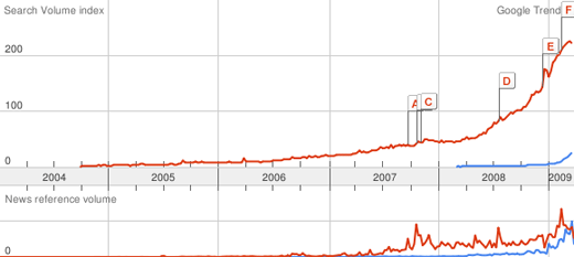 Anyone with a web presence can probably tell you that Twitter's growing extremely fast.  It's outpacing Facebook's growth in the same period, according to Nick O'Neill's analysis using Google Trends.  Here's the chart: